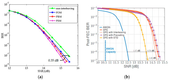 BER performance analysis: (a) proposed PBM; (b) DFE with interleaving and pre-coding in Reference [19].