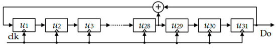 Generally, a serial PRBS generator, as the signal source, employs a linear-feedback-shift-register (LFSR), as shown in Figure 11 [22], in which u1~u31 represents the serial shift register and ⊕ is the XOR operation. Since register u31 can output signal Do through the shift operation in the direction of u31, this structure encountered challenges in interactive efficiency, complexity and consumption. To achieve high interactive efficiency, where it takes one period to generate m-bit parallel signals, the adopted structure is an m-lane serial PRBS31 generator, e.g., m = 40. However, there are 1240 (=40 × 31) registers and 40 XORs, which significantly increase complexity and consumption. The serial generator requires 40 periods to generate a set of 40-bit signals, greatly reducing the interactive efficiency. From the perspective of compromise, the next focus is the parallel optimization of the PRBS generator.