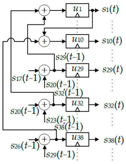 The second step is the reduction in fanout through logic expansion technology. For the 23rd column, marked by the dashed line in Equations (A1) and (9), some registers in many feedback paths, such as s1(t), s7(t), s32(t) and s35(t), are related to s23(t), indicating that the fanout is 4. Take s1(t) as an example. S17(t – 1) and s23(t – 1), before optimization, are XOR with s20(t − 1), respectively, and then a new combination circuit is obtained and constructed with and , as shown in Equation (10). So, s1(t) can only be related to the current input of s29 and s32, rather than s23(t − 1), which can reduce the fanout of s23, and so on. The fanout can be reduced to 2.