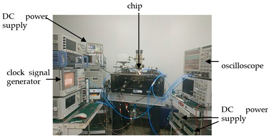 Table 2 provides many parameters during simularion and measurement. During simulation and measurement, the power supply and frequency are two controlled parameters, in which the power supply depends on the adopted technology, e.g., 1.2 V power supply for 65 nm LP technology. In order to achieve a better performance, e.g., frequency, SS corner is generally considered in the simulation [26]. However, masks in the fabrication, provided by the foundry, are a main influence on measurement results and an uncontrollable factor. From the perspective of frequency, the measurement result is slightly larger than the simulation result due to the location of the chip on the wafer.