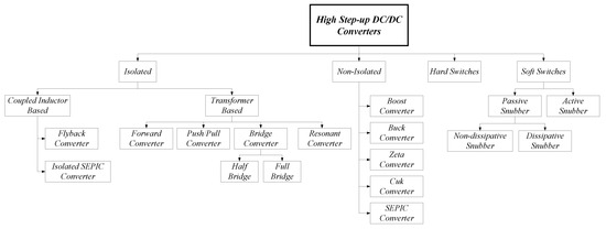 DC–DC converters are typically categorised into two different classifications: isolated and non-isolated. Topologies that are not isolated, such as buck, boost, cuk, zeta, and single-ended primary-inductor (SEPIC) converters, transfer power without magnetic isolation [3], and are utilised so as to obtain a substantial increase in voltage gain. In recent years, various non-isolated topologies for high step-up voltage gain have been developed. Techniques such as Interleave Boost (IB), Coupled Inductor (CI), Switched Capacitor (SC), Cascaded Boost (CB), Switched Inductor (SI), and Voltage Multiplier (VM) [4,5,6,7,8,9] have been employed to achieve a high voltage gain by appropriately adjusting the duty ratio. Nevertheless, these methods may suffer from inefficiencies caused by the need for an extensive amount of circuit components, and they may not meet the requirements for galvanic isolation [10].