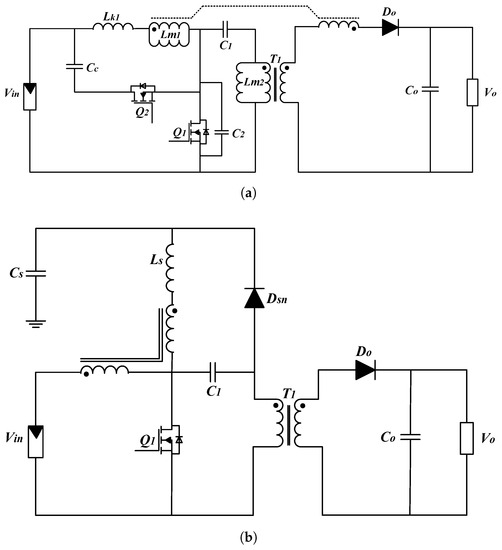 Active Snubber Circuits. (a) Isolated high step-up active clamp flyback converter (), and (b) isolated high step-up forward–flyback Converter (FFC) using the active clamp ().