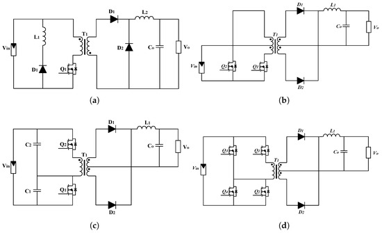 Transformer-Based Converter. (a) Conventional forward converter, (b) conventional push-pull converter, (c) conventional half-bridge converter, and (d) conventional full-bridge converter.