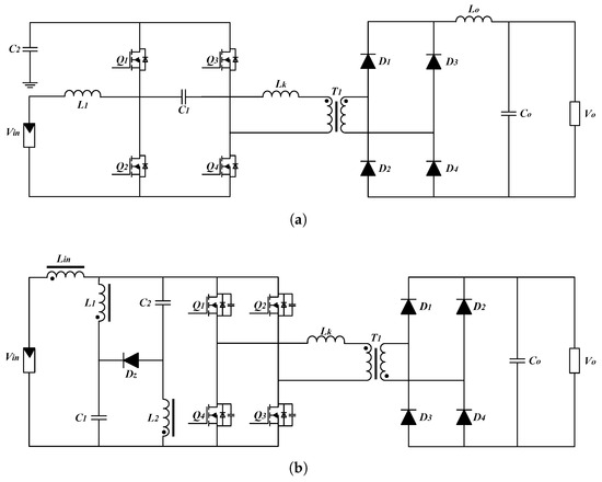 Full-Bridge Converter Topologies. (a) Isolated high step-up boost full-bridge topology (), and (b) isolated high step-up CF full-bridge topology with a quasi-Z-source network ().