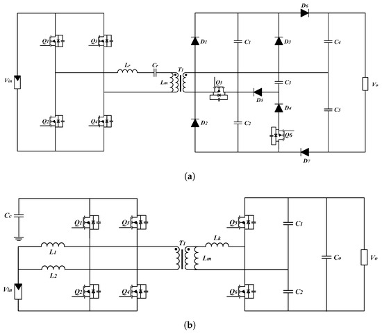 Resonant Converter Topologies. (a) Isolated high step-up LLC topology based on a reconfigurable rectifier (), and (b) isolated high step-up resonant topology with the ripple-free input current ().