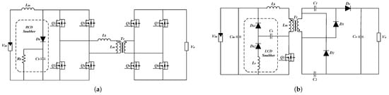 Passive Snubber Circuits. (a) Isolated high step-up full-bridge boost topology using a passive RCD snubber (), and (b) isolated high step-up coupled inductor topology with a nondissipative LCD snubber ().