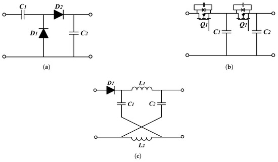 Voltage Multiplier Cells (VMCs) are utilised in isolated DC–DC converters to increase voltage gains and mitigate voltage stress. VM circuits use a chain of diodes and capacitors to boost the output voltage, thus making them inexpensive, simple, and efficient [35]. VMCs are widely used to overcome the limitations of traditional boost converters. According to [35], VM circuits can be used on the input side after the main switch to minimise over-voltage. To rectify AC or pulsating DC voltage, VMCs can also be used at the output stage of the secondary to the magnetic coupling.