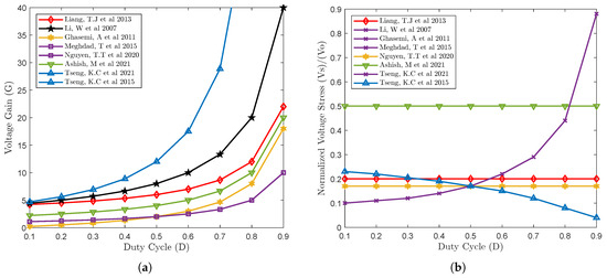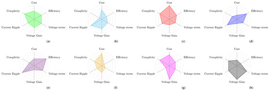 In [48] (Figure 5a), this topology was introduced in a novel isolated SEPIC converter with coupled inductors. A significant output voltage gain is achieved while the switch voltage stress remains the same as in a standard isolated SEPIC converter. The Zero-Voltage Switching (ZVS) condition is achieved in the circuit when the primary switch is turned off as the snubber capacitor in the circuit ensures that the switch voltage remains at zero. The clamp capacitor absorbs some of the leakage inductance energy. The energy contained inside the clamp capacitor is then transferred to leakage inductance by activating the clamp switch. At this point, the snubber capacitor of is discharged, and the (ZVS) state is obtained at the time of turn-on by shutting off the active clamp switch. In [49] (Figure 5b), a new high step-up topology was introduced that uses an isolated SEPIC DC–DC converter along with a lossless snubber circuit. A magnetic network is included in the architecture to eliminate ripples in the input current. The voltage stress of the main switch was clamped at about twice the input voltage. Compared to a conventional isolated SEPIC with a standard RCD snubber, this design has a 20% lower voltage stress and a 1.3% improvement in efficiency. However, the conduction loss increases with a higher turn ratio, and the larger size of the coupled inductor exacerbates this issue [45]. Table 2 represents a quantitative summary of the topologies examined in this section, in which numerous factors are covered, such as component count, cost, switching voltage stress, duty cycle ratio, output diode voltage stress, switching mode, input current ripple, voltage conversion ratio, and peak efficiency. The methodology used to calculate the cost is outlined in Appendix A.