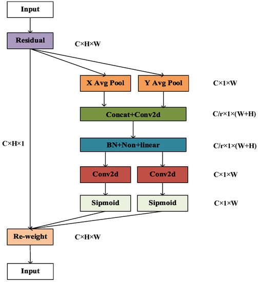 In order to solve the above problems, the Coordinate Attention (referred to as CA) is added to the network structure []. CA not only captures information between channels but also embeds direction-related positional information within channel attention. This effectively mitigates the issue where the channel attention mechanism tends to overlook positional information. Moreover, CA can encode information over a larger area, enabling the network to detect small targets across a broader range []. The structure of the CA module is shown in Figure 2, where “Residual” represents the residual structure, and “X Avg Pool” and “Y Avg Pool” represent average pooling in the X and Y directions, respectively.