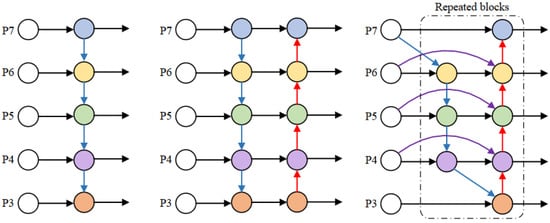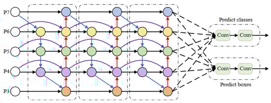Based on the standard feature pyramid, BiFPN achieves the purpose of simplifying the feature network by deleting the intermediate nodes with only one output edge []. At the same time, additional edges are added at the same level between the input and output nodes to fuse more features at a low cost. Finally, BiFPN processes each bidirectional path (top-down and bottom-up) as a single feature network layer and repeats the layer multiple times to achieve higher-level feature fusion. As shown in Figure 4, P3–P7 in the figure represent different levels of fused features. The blue arrow represents a top-down path, the red arrow represents a bottom-up path, and the purple arrow represents adding other edges to the input and output nodes of the same level.
