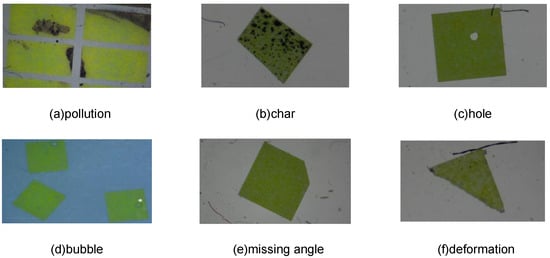 There are six main defects caused by the above reasons. By categorizing the types of defect detection, the defects are classified into two types: surface damage and shape damage. Surface damage includes pollution, char, hole, bubble, and other types, while shape damage includes missing angles and deformation, among others. The annotation software LabelImg 1.4.3 is used to annotate the data, classifying defects into two categories: surface damage and shape damage. Figure 7a–d depict common surface damage, while Figure 7e,f depict common shape damage. The following are all defects of the original sample.
