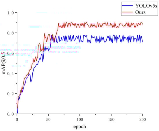 In the case of setting the same training parameters, the improved YOLOv5s defect detection model and the original YOLOv5s model were trained for 200 rounds. The training results were saved once after each round of training, resulting in 200 saved training results. The obtained mAP change curve is shown in Figure 8 (the red curve represents the improved model, and the blue curve represents the original model). It can be seen from Figure 8 illustrates that the mAP value of the improved detection model is greatly improved compared with the original YOLOv5 model. The final mAP value is the best mAP value in 200 rounds of training.