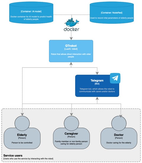 The proposed system consists of four actors: (1) QTrobot, capable of interacting with the (2) elderly person in need of assistance. In addition, continuous updates are provided to (3) caregivers and (4) doctors to ensure full control of the elderly person’s health and mental state. Table 2 shows the functional requirements.