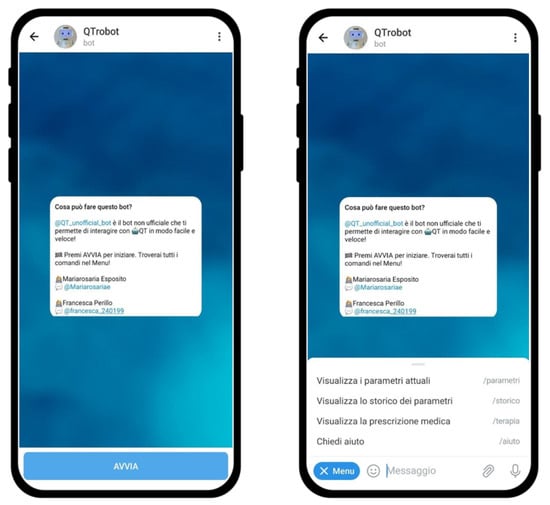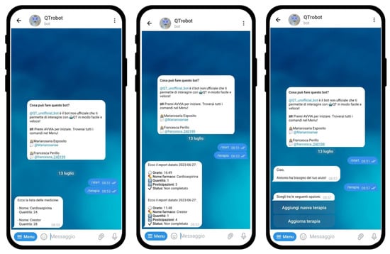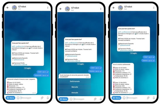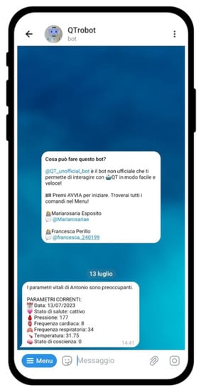 Based on the processed data, QTrobot interacts in interactions with elderly, doctors, and caregivers through a Telegram bot interface. This allows doctors and carers to stay informed about the clinical and psychological status of the elderly person.In addition, the elderly person can interact with the robot using machine learning algorithms for face and voice recognition.As a result, the robot can respond and interact with the elderly person based on their current emotional state.The robot sends messages to the Telegram bot providing updates on the elderly person’s physical and mental state, ensuring continuous real-time monitoring of their clinical and psychological condition.The Telegram bot facilitates bi-directional communication between relatives and doctors within the robotic system. For example, relatives can access current parameters, view historical data of all parameters in daily, weekly, monthly or yearly formats, and review prescriptions issued by the doctor.
