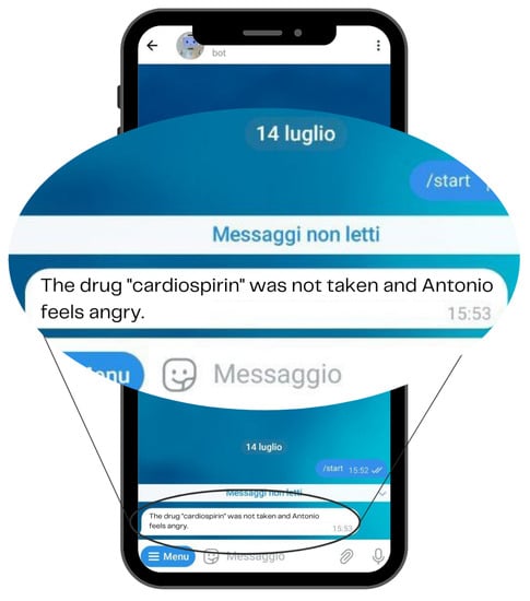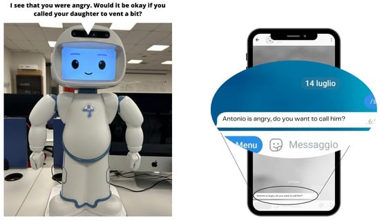 In case an elderly person has not taken the prescribed medication, the robot not only takes care of reminding him or her, but also asks about the elderly person’s state of mind to get a more complete view of his or her general state (Figure 8).
