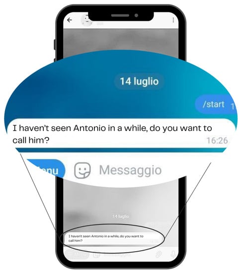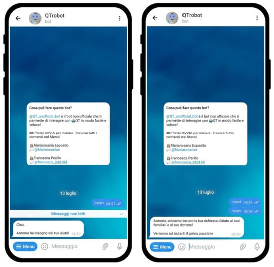 Through the Telegram bot, elderly people have the ability to make requests for help, which they would normally expose verbally to QTrobot, even when the robot is not nearby. This mechanism ensures an always-on communication channel for the elderly person, allowing them to report emergency situations or need assistance at any time, as shown in Figure 11. Thanks to the Telegram bot, caregivers and doctors can easily see these requests for help. This allows them to intervene as quickly as possible, offering immediate support to the elderly person and ensuring timely and appropriate care.