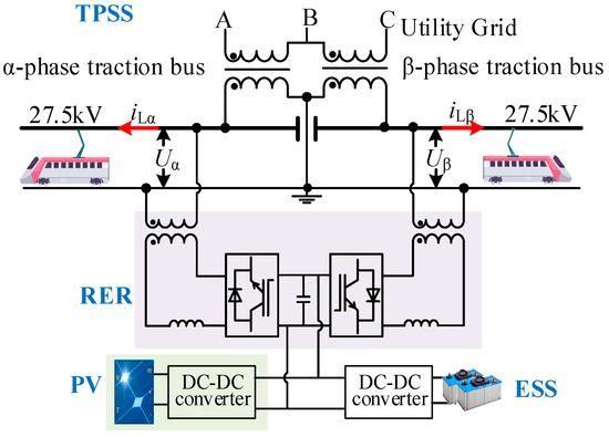 The topology of RERs is illustrated in Figure 1. Two-phase traction buses with 27.5 kV voltage are connected to a three-phase grid through a V/V traction transformer. The back-to-back inverter is composed of two single-phase voltage source inverters (VSCα/VSCβ), whose AC sides are connected to the traction buses via step-down transformers Tα and Tβ, respectively. The inverters are interconnected by a buffer capacitor on the DC side. The PV system and ESS are integrated into the traction power supply system through the back-to-back inverter’s DC bus.