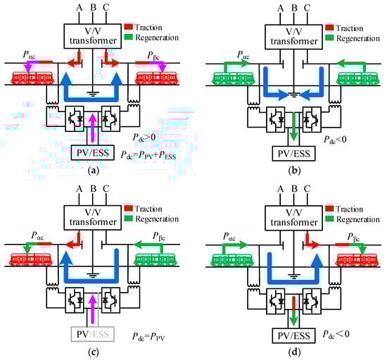 As shown in Figure 1, many uncertain factors lead to the complexity of energy flow, e.g., whether the two feeder loads are in traction state or in regenerative braking state, whether the PV system is in working state or not, whether the ESS is charging or discharging. For ease of analysis, four typical modes are summarized in Figure 2.