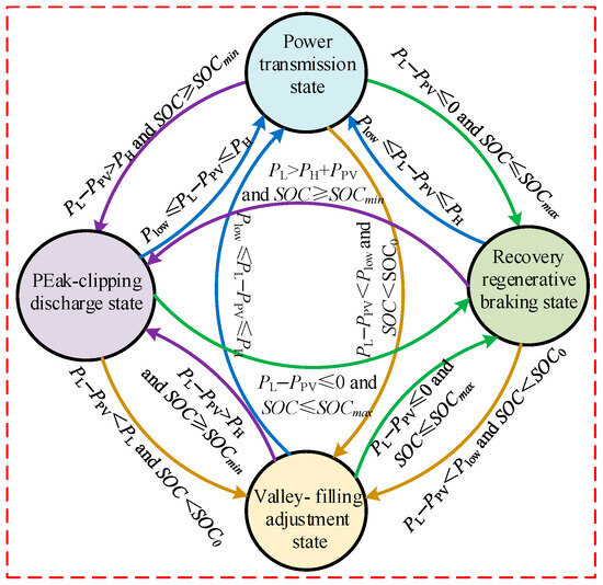 - Judge state: Based on the instantaneous power of the traction load and PV system, and the instantaneous SOC(t) of the ESS, as well as the peak and valley values obtained in the previous step, the system operation status is judged in real time. Specifically, it is divided into peak-clipping discharge state, recovery regenerative braking state, power transmission state, and valley-filling adjustment state. The specific judgment process is shown in Figure 3, and the transition relationships among different operation states are shown in Figure 4.