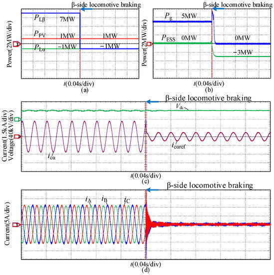 Before β-side locomotive braking, the loads are −1 MW and 7 MW, respectively, and the system is in power transmission state. The 1 MW active power generated by the PV system is absorbed; the ESS does not work; and the consumption of the upper-grid power is 5 MW. After β-side locomotive braking, the load changes to −1 MW, and the system is in recovery regenerative braking state. The ESS is in charging state, absorbing the regenerative braking energy of the two traction buses. The 1 MW active power generated by the PV system is directly absorbed by the ESS, and no energy is fed back to the upper grid. The DC bus voltage of the RER introduced in Figure 9c remains around its reference value, which ensures the normal operation of the RER. The result of converter α tracking the reference current shows that the dual-vector MPC method can ensure the accurate tracking of current. As shown in Figure 9d, when the RER works in power transmission state, the grid-side currents of the traction transformer are almost symmetric; when the RER works in recovery regenerative braking mode, the primary-side currents of the traction transformer almost become 0.