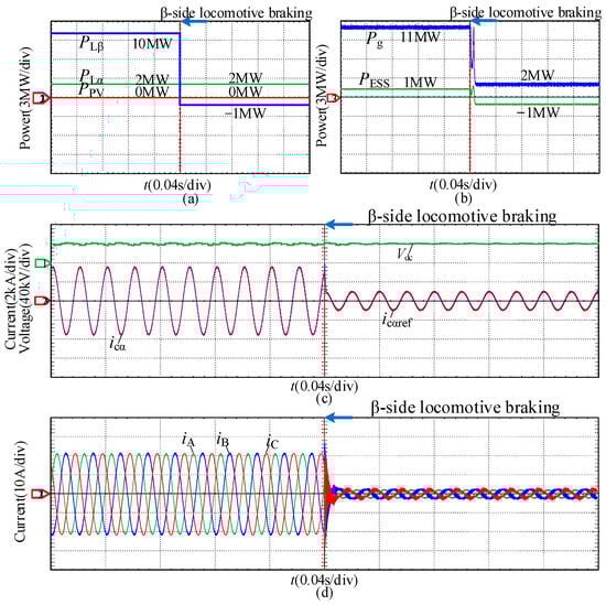 Before β-side locomotive braking, the loads are 2 MW and 10 MW, respectively, and the system is in peak-clipping discharge state. The ESS is in discharging state, providing 1 MW active power to the traction bus; the PV system does not work; and the consumption of the upper-grid power is equal to the preset peak value (11 MW). After β-side locomotive braking, the load changes to −1 MW, and the system is in valley-filling adjustment state. The ESS is in charging state, acting as a load and consuming 1 MW active power, absorbing the regenerative braking energy of the two traction buses. The whole system consumes upper-grid power equal to the preset valley value (2 MW). The DC bus voltage of the RER introduced in Figure 10c remains around its reference value, which ensures the normal operation of the RER. The result of converter α tracking the reference current shows that the dual-vector MPC method can ensure the accurate tracking of current. As shown in Figure 10d, the grid-side currents of the traction transformer are almost symmetric.