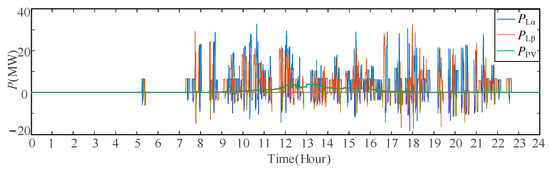 Considering the daily periodicity of train operation, this section selects the typical daily measured load data of a traction substation in a high-speed railway section (sampling interval: 1 s/time). Correspondingly, the PV system selects the measured power generation data of the PV power station near the traction substation during a typical summer day (sampling interval: 1 min/time) to further evaluate the engineering capability of the RER.