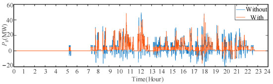 Figure 12 shows the changes in total active power on the traction side without and with RER deployment. Thanks to the addition of a PV system and an ESS, the power consumed by the traction is obviously decreased after RER deployment. The total traction power is reduced from 85.1 MWh to 71.8 MWh, and its rate of decrease is 15.63%. The energy recovery efficiency of RBE is 86.81%. The consumption of the PV system is 5.45 MWh, and the consumption rate is 68.76%.