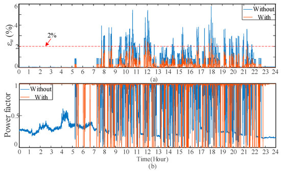 Improved results of power quality without and with RER deployment. (a) The 95% probability value of the voltage imbalance degree; (b) power factor.