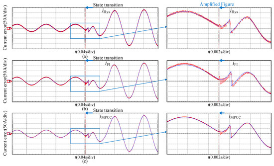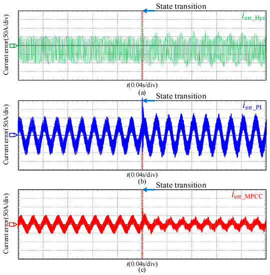- Comparison of different control strategies: hysteresis control [16,17,18,19], PI control [20], and the proposed dual-vector MPCC strategy. The specific operating conditions involve transitioning from recovery regenerative braking state to peak-clipping discharge state. Figure 15 illustrates the current of inverter α following the application of three different control strategies. It can be observed that during transient processes, when employing the proposed dual-vector MPCC strategy, there is high precision in tracking the reference current with minimal current deviation. Figure 16 shows the current-tracking error when three different control strategies are adopted for converter α. It can be observed that the current error is minimized when employing the dual-vector MPCC strategy. Therefore, the current-tracking error can be employed effectively, and current-tracking accuracy can be improved by using the proposed dual-vector MPCC strategy.