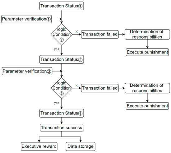 These four parts are the parts that need to be considered when designing smart contracts. These four parts are interrelated and together form a complete smart contract architecture to ensure the correct execution, security, and scalability of the smart contracts of transactions. Such a hierarchical design divides the intelligence into four parts, so that each part can be considered and designed independently, and the parts are interrelated to form a complete architecture of smart contracts. When designing a smart contract, it is necessary to comprehensively consider the characteristics of the transaction and fully consider the design and implementation of each part to meet the needs and goals of the transaction. At the same time, it is also necessary to follow the characteristics and limitations of the blockchain platform to ensure the efficient execution and stable operation of smart contracts. The smart contract flow chart is shown in Figure 2.