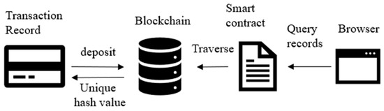 Smart contracts record the details of transactions and store them in the blockchain. This information includes transaction time, the identity information of a transaction’s participants, relevant data on items, etc. Such records ensure the traceability of transactions, enabling parties to query and verify the authenticity and integrity of transactions. When querying a certain transaction, one can query through the unique hash value of a transaction, traverse the entire blockchain, and return the transaction record with the same hash value. Each block contains the hash value of the previous block, forming an immutable chain structure. If someone tries to tamper with the previous transaction records, the integrity of the entire blockchain will be destroyed, ensuring that the transaction’s information cannot be tampered with. The transaction traceability process is shown in Figure 3.