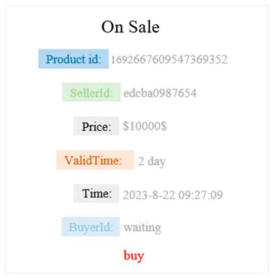 During the validity period, the buyer needs to pay the purchase funds to the smart contract, and the seller also needs to reply to the buyer’s transaction within the contract’s validity period. If one party fails to perform their corresponding operation within the validity period, the transaction will fail and a transaction penalty will be imposed. The user purchase interface is shown in Figure 5. After the buyer purchases, the transaction status changes to complete, and then the buyer’s information is recorded and both parties perform their subsequent operations.