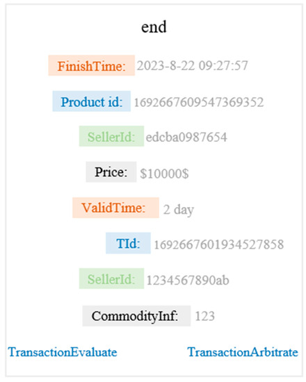 After the smart contract receives the request from the seller and meets the conditions for releasing the transaction funds, it will transfer the fee paid from the buyer to the seller, and then the seller will deliver the product, complete the transaction, and implement incentive measures for both parties. At the same time, a transaction evaluation can be conducted. If both parties are not satisfied with the transaction, they can apply for arbitration. The transaction information is shown in Figure 6 below.