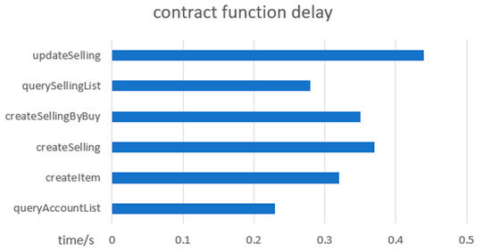 Based on the above smart contract’s architecture, the relatively important functions in the written contract were tested, including querying users, registering items, creating transactions, executing transactions, querying transaction records, and updating functions. These functions were specifically representative of the contract, and these functions were tested at the required time. The test results are shown in Figure 9. It can be seen from the figure that the time required to query contracts was 0.2~0.3 s, while the time required to register items and create transactions was generally higher than 0.3 s. This is because when the contract executed the query function, it only involved reading the data on the chain, without modifying the status or executing complex business logic. In contrast, contracts for purposes such as creating transactions and executing transactions may need to write new data according to the logic relationship to judge the process of the contract’s execution, which will lead to an increase in execution time. The overall test of the architecture conforms to the actual production environment and can be applied.