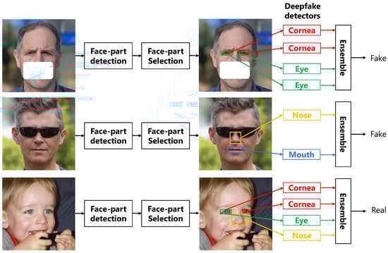 The rest of this paper is organized as follows: The proposed method is introduced in Section 2. We present an analysis of the effectiveness of each CNN model specialized for a single face part and various ensemble models of their CNN models in Section 3. We show the evaluation of face-part detection in Section 4. We compare our approach, which is based on dynamic ensemble selection, with the state-of-the-art methods in Section 5. We discuss the potential and challenges of deepfake detection based on face parts and their combination in Section 6. Finally, we present our conclusions in Section 7.