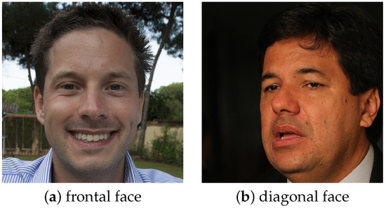 We prepared 1000 annotated images from FFHQ and 388 annotated images generated by StyleGAN3 [28] for face part detection, and trained two YOLOv8s models with and without homography on the FFHQ images, respectively. Moreover, we prepared 100 frontal face images and 100 diagonal face images from the FFHQ dataset as test data. We show examples of frontal and diagonal faces in Figure 4.