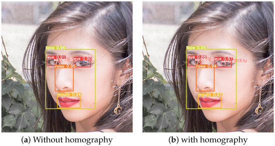 We show the average precision (AP) of each class and mean average precision (mAP) of face-part detection in Table 5. As shown in the table, we improved the detection performance for each face part for diagonal faces using data augmentation based on homography. We realized accurate face-part detection in both cases of frontal and diagonal faces. Moreover, YOLOv8s achieved higher mAP than YOLOv5s. Therefore, we selected YOLOv8s in the following experiments. An example of a face-part detection result by YOLOv8s trained with homography is shown in Figure 5.