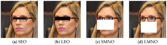 Examples of occluded images of each test dataset. (a–d) Small eye occlusion (SEO), large eye occlusion (LEO), small mouth and nose occlusion (SMNO), and large mouth and nose occlusion (LMNO), respectively. The images are generated from an image of FFHQ [20].