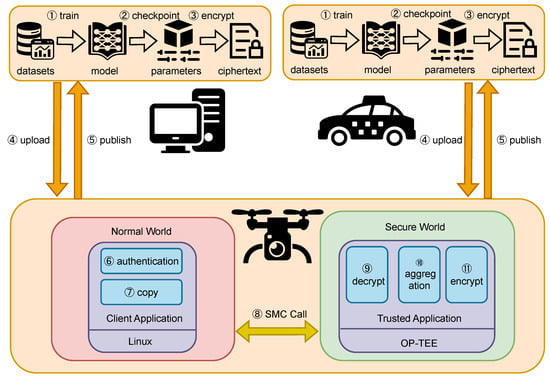 Alves et al. [22] introduced for the first time the application of ARM TrustZone within embedded systems. Liu et al. [23] innovatively incorporated ARM TrustZone, employing a trusted computational block to safeguard peripheral devices from unauthorized access by malicious applications. However, this research does not delve deeply into the specific task of federated learning. Zhang et al. [24] explored the utilization of multiple UAVs for federated learning tasks. However, their study did not introduce TEE to address the security concerns of federated learning. Mo et al. [25] proposed a privacy-preserving federated learning (PPFL) framework that leverages mobile devices with TEE environments to curtail privacy breaches in federated learning. However, this framework is not tailored specifically for UAVs.