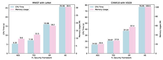 We train MNIST with LeNet and CIFAR10 with VGG on client-side devices. The trained models are then uploaded to an aggregation server where different security frameworks are applied for aggregation. Because of the limited secure memory within the TEE, we transmit only a subset of the model’s layers for aggregation within the secure world, subsequently exchanging them with the normal world. Besides, DP and HE are also executed in the normal world. We define a full federated learning round as the whole period, which starts from the reception of model parameters from all clients, continues with the aggregation of global models, and ends with the distribution of the model to respective clients. We use two performance metrics to quantify the runtime overhead of various security frameworks: The CPU time refers to the average duration taken for a single round, while memory usage indicates the average memory consumed during a round. For the MNIST with LeNet, we set the number of rounds to 200, and for CIFAR10 with VGG9, we set the number of rounds to 500. The aggregation algorithm used is FedAvg. Figure 3 shows the results of CPU time and memory usage of REE, TEE, DP, and HE.