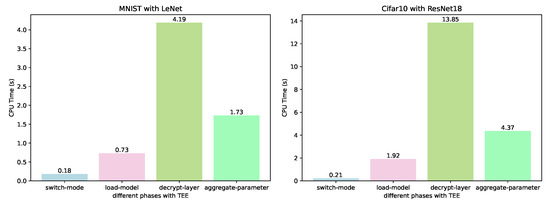 Compared to REE, TEE exhibits a 35.0% increase in CPU time and a 28.1% increase in memory usage for MNIST with LeNet. Similarly for CIFAR10 with VGG9, TEE shows a 42.4% increase in CPU time and a 36.1% increase in memory usage. This increase originates from the additional overhead introduced by the TEE security mechanisms, including the mode-switching time between the secure and normal worlds, the model copy overhead from the secure world to the normal world, and encryption/decryption cost for the model. The time overheads for these phases are measured in Figure 4. The transition from LeNet to VGG9 results in additional increments in the CPU time and memory usage for TEE when compared to REE. This is because VGG9 has a larger model size, which incurs significant complexity during encryption, decryption, and processes.
