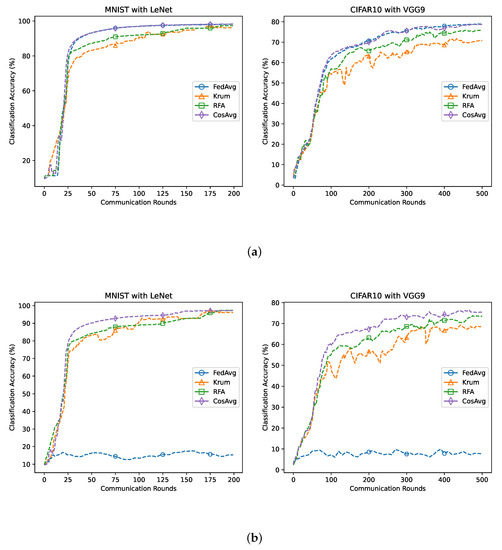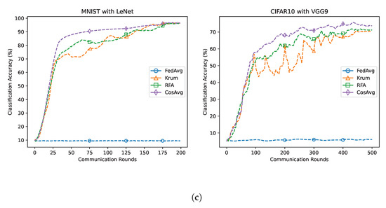 We first compare the performance of the proposed CosAvg algorithm with other aggregation algorithms on two datasets, MNIST and CIFAR10. FedAvg is used as the baseline, while Krum and RFA are compared as commonly used robust aggregation algorithms. We engaged clients to participate in the federated learning tasks, and the dataset was divided randomly into 200 segments. Each client independently trained for 3 epochs, locally, before transmitting the updated model parameters to the aggregation server. We set the number of FL rounds, and , for CIFAR10. We assess the robustness of aggregation algorithms by comparing the accuracy of the aggregated models. A smaller decrease in model accuracy when malicious clients are present indicates a stronger ability to resist Byzantine attacks. Each sub-figure in Figure 5 illustrates how the accuracy of the aggregated model on the test dataset changes as the number of federated learning rounds increases under different aggregation algorithms. We assume that the attackers have complete control over the local model and can make arbitrary adjustments to the model parameters within the updates. Additionally, they possess the ability to collaborate with other malicious clients to achieve consistent updates, thereby increasing the difficulty of detection.