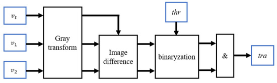 The simple and practical traditional method of defect detection should not be abandoned entirely. Traditional defect detection methods are introduced, including image difference and binarization processing. Three images are input, including two images with randomly selected normal testing results from normal ultrasonic detection datasets, and one image of ultrasonic data to be detected, and the image difference method is carried out after gray-scale transformation. While , is the output result, the mathematical expression of threshold processing is shown in Equation (1), and the dual-normal detection image processing method adopted in this study is shown in Equation (2). is the threshold. v represents a kind of image. and are two randomly selected images of the normal state, and is the test image to be detected. After the image difference method, two feature tensors with the same dimensions as the image gray-scale transformation are output. The same threshold is set for binary processing. The output image is obtained by the Hadamard product of two image dimension variables. Figure 1 depicts this improved difference calculation process. In this paper, the traditional method is combined with the contrast learning network to improve the defect detection effect of the S-scan data, and only the contrast learning method is used for the cylinder structure.