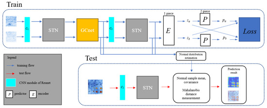According to the defect-free normal detection image set composed of different normal images, considering the relatively small amount of data in the training stage and in order to reduce the loss of information in the network, two output points are set on the network. The feature map of the two output points is synthesized (10). The function corresponds to lines 3 through 9 of the pseudo-code in Algorithm 1. The mean and covariance characteristic quantities are called the normal distribution parameters, and the distance we need is calculated using Equation (11).