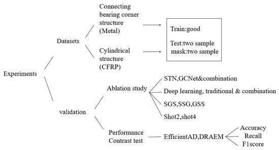 The implementation of deep learning consists of software and hardware. The hardware part adopts a GTX 1080 Ti with 11 GB video memory, and the software part adopts the pytorch framework (1.10.0 version). The SGD optimizer with a learning rate of 0.0001 and momentum of 0.9 is used in the proposed contrast network. The dataset consists of an unsupervised learning part and a defect depth dataset with a supervised learning label. The detection data of the flatten panel is considered to be easier to obtain due to the type and cost of the probe. Hence, the unsupervised comparative learning part is composed of the S-scan dataset of the L-shaped structure and the C-scan detection dataset of the panel part. The dataset of the metal L-shaped structure and the dataset of the panel part include 90 normal ultrasonic S-scan images and 90 normal ultrasonic C-scan images, respectively. The dataset structure is shown in Figure 7. The cylinder structure uses the flatten panel’s ultrasonic detection data for training.