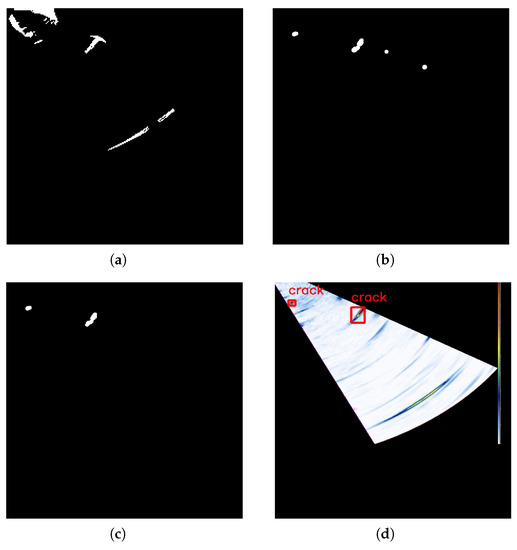 The detection beam transmission map is shown in Figure 6. In the cylinder structure, the two samples are basically consistent in shape, detection setting, and principle, so they are unified as a schematic diagram in Figure 6e,f. Considering the characterization of defects using the −6 db method and further performance improvement, for the traditional image difference method, the threshold should exceed 128 and be set to 150.
