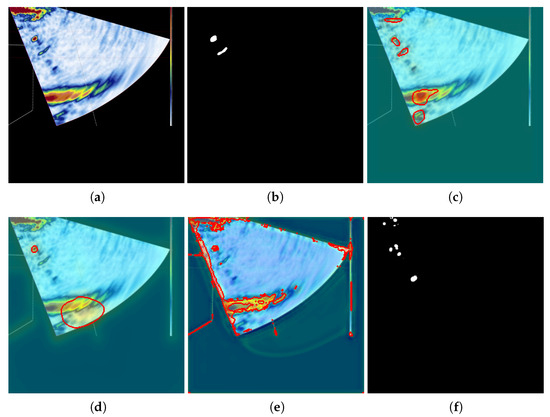 Comparison of cylinder structure detection results with other detection methods. (a) Original data, (b) mask label, (c) EfficientAD, (d) reverse distillation, (e) DRAEM, and (f) proposed method.