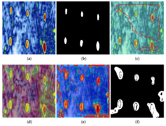 In Equation (10), T represents the transpose, represents the feature vector after the image passes through the network, is the mean value of the vector, and the subscript m,n maps the corresponding position of the original size map. is the corresponding covariance matrix. The mean and covariance values provided relate to the computation of the mean and covariance shown in the latter portion, from line 11 to line 19 in pseudo-code Algorithm 1. The diagonal element of the covariance image matrix represents the difference between pixel values and at corresponding positions of the input image, and the non-diagonal element represents the correlation between different pixel values. Therefore, it can be seen that the average value and covariance feature map can represent the main features of the images in the normal detection image set without defects. According to the network loss function, the feature quantity between the normal detection images is relatively close. When the abnormal detection image is input into the network, the vector data with large difference from the normal feature quantity will be obtained at the two output points, that is, the abnormal detection image will be far away from the normal distribution of the normal distribution parameters at the corresponding position of the defect. In this paper, Mahalanobis distance is applied to calculate the image point by point, and the threshold processing is used to help locate the defects. D represents the defect’s distance measurement, which measures the possibility between defect or normal situation, and Mahalanobis distance is calculated according to Equation (9). The larger the D value of a certain position, the higher probability of defects exists at that position.