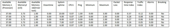 - Overall available memory: This parameter measures the overall memory availability in percentage terms. For instance, a reading of “100%” implies that all of the memory or RAM capacity is available for utilization. The percentage symbol was removed during data preprocessing due to model limitations. Subsequently, the numerical value was simplified from 100 to 1 to facilitate data handling.