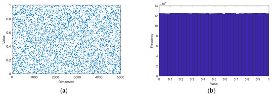 where η and μ are the control parameters, respectively. γ is the sequence value of the SPM map. is the sequence number. rand is a random number. When , , the system is in a chaotic state. As shown in Figure 3, the SPM map is uniformly distributed and has a uniform probability density distribution. It indicates that the SPM map has good ergodicity. The following are the steps of the chaotic perturbation operator.